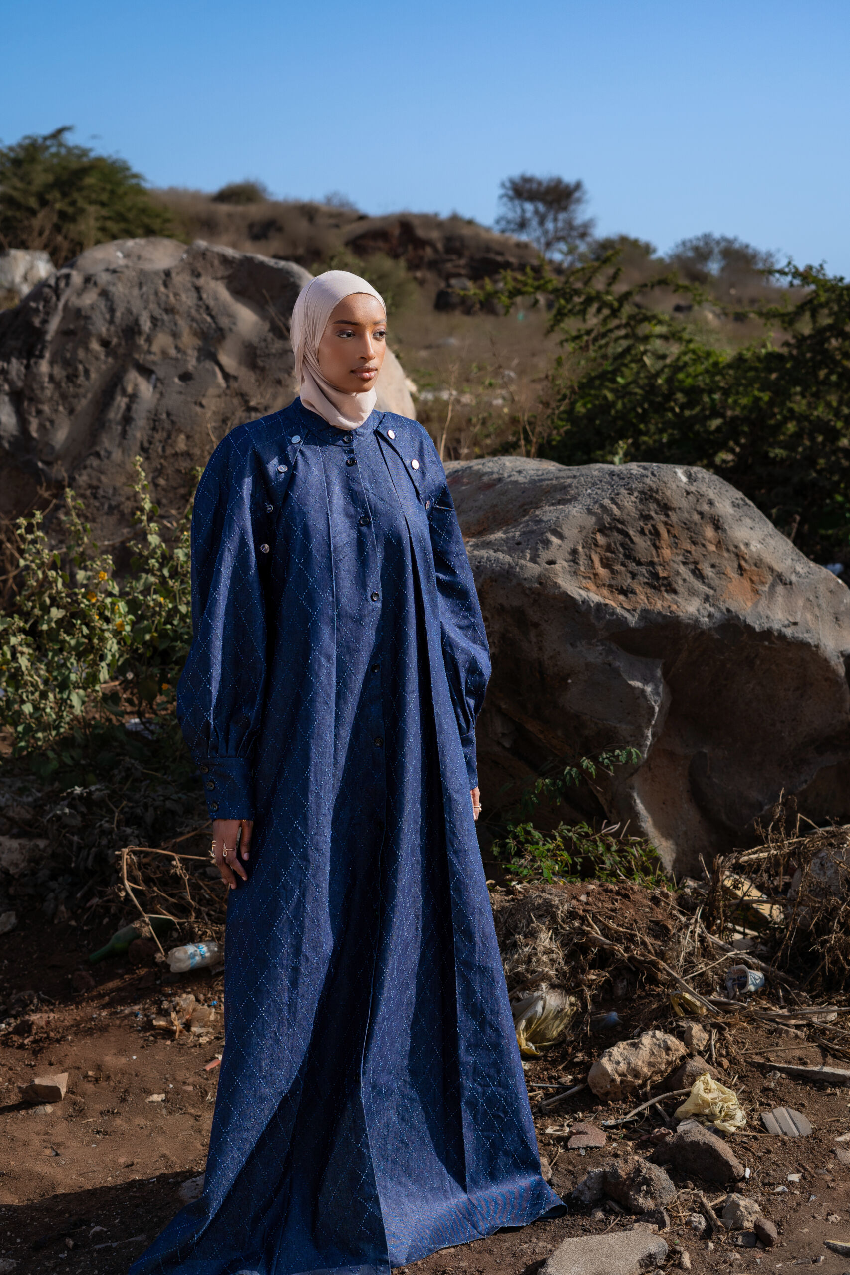 « Les Vents Contraires » (Femme) Elle est faite pour celles qui changent de forme sans perdre leur essence. Les manches se détachent comme les attaches d’une époque révolue, les boutons s’ouvrent sur un avenir choisi. La robe mêle une coupe asiatique stricte à des détails moyen-orientaux modernes, pour une femme plurielle : douce, forte, imprévisible. C’est la tenue de la femme qui voyage en elle-même, qui décide à qui elle offre ses bras, et quand elle les replie.