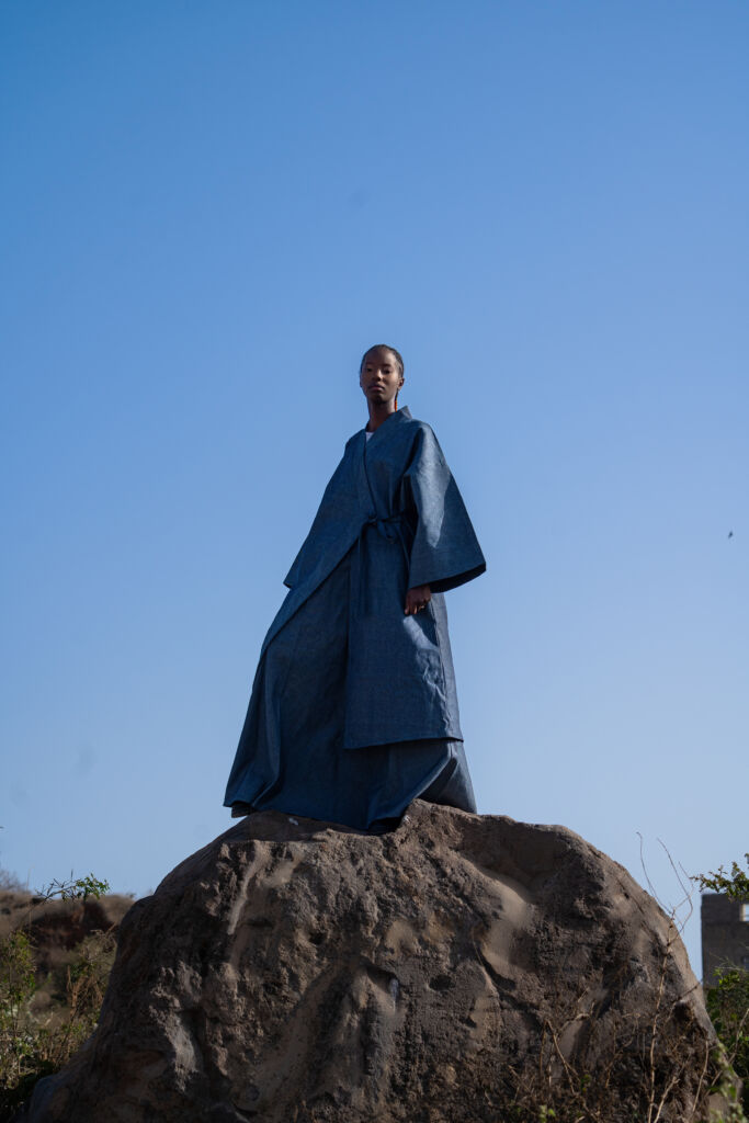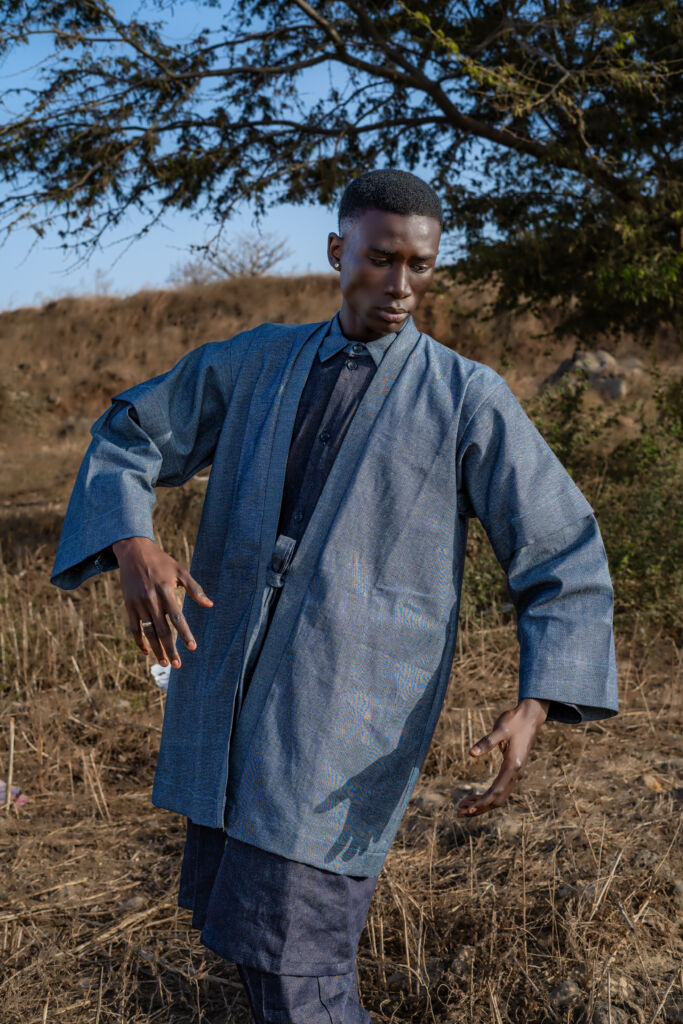 « L’Équilibre du Marcheur » Il avance doucement, sans faire de bruit. Son allure est fluide, presque dansante, comme les pas des moines ou les gestes des maîtres du thé. Cet ensemble puise dans l’esthétique japonaise kimono sobre, volume mesuré, structure cachée. Il incarne un homme intérieur, raffiné, urbain mais connecté à l’essentiel. Il ne parle pas fort. Il porte.