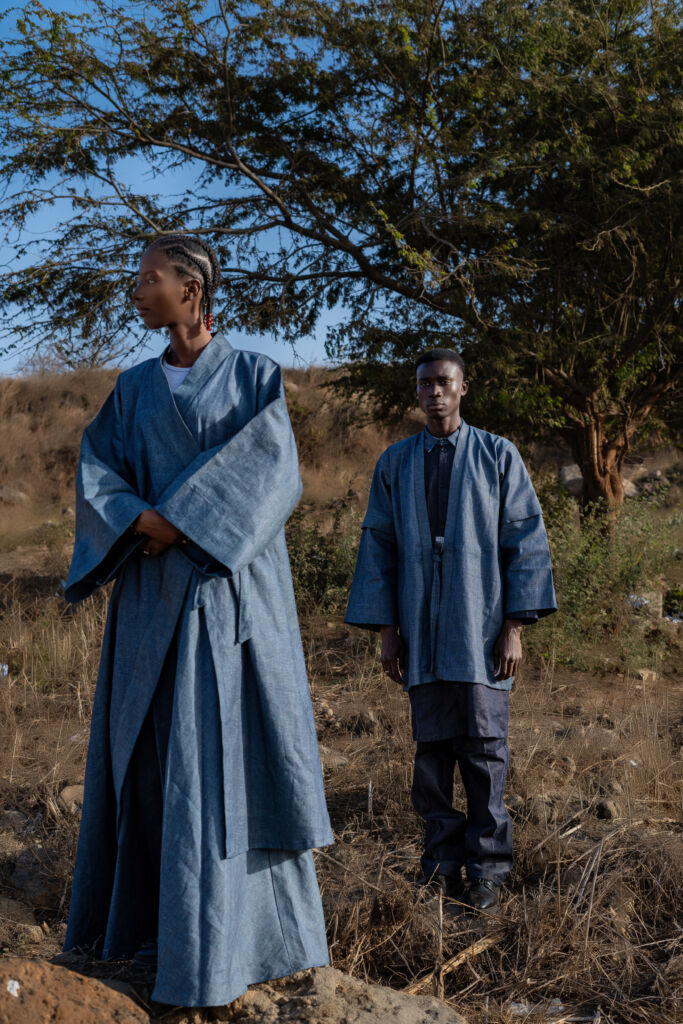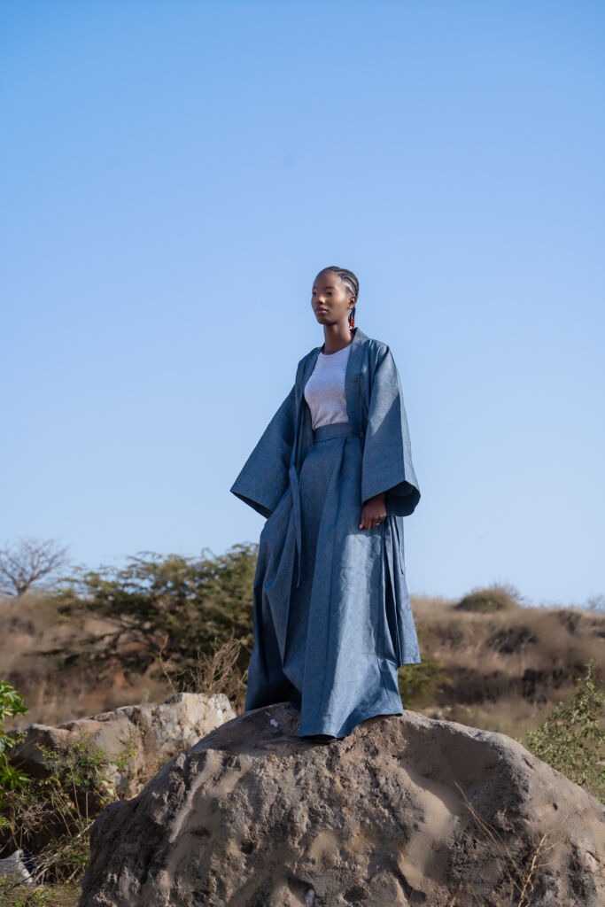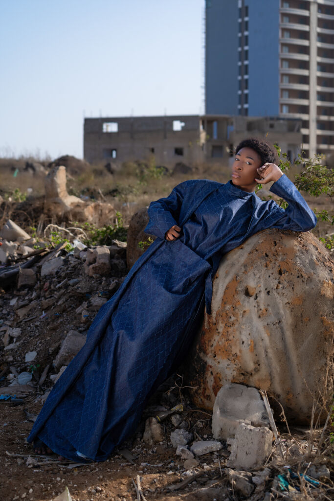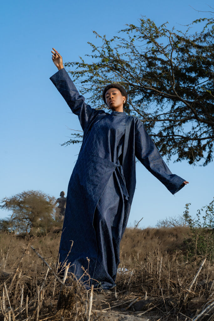 « Le Pont du Silence » (Homme) Il est né entre deux continents. À l’Ouest, les longues étoffes du Sahel, symboles de sagesse et d’autorité. À l’Est, la rigueur du col Mao, ligne droite et pensée juste. Cette pièce raconte l’histoire d’un homme qui ne choisit pas entre ses héritages : il les porte. Le boubou devient seconde peau, sculpté près du corps, épousant l’identité multiple de celui qui marche entre tradition et renouveau. C’est la tenue de l’homme en paix, mais jamais figé.