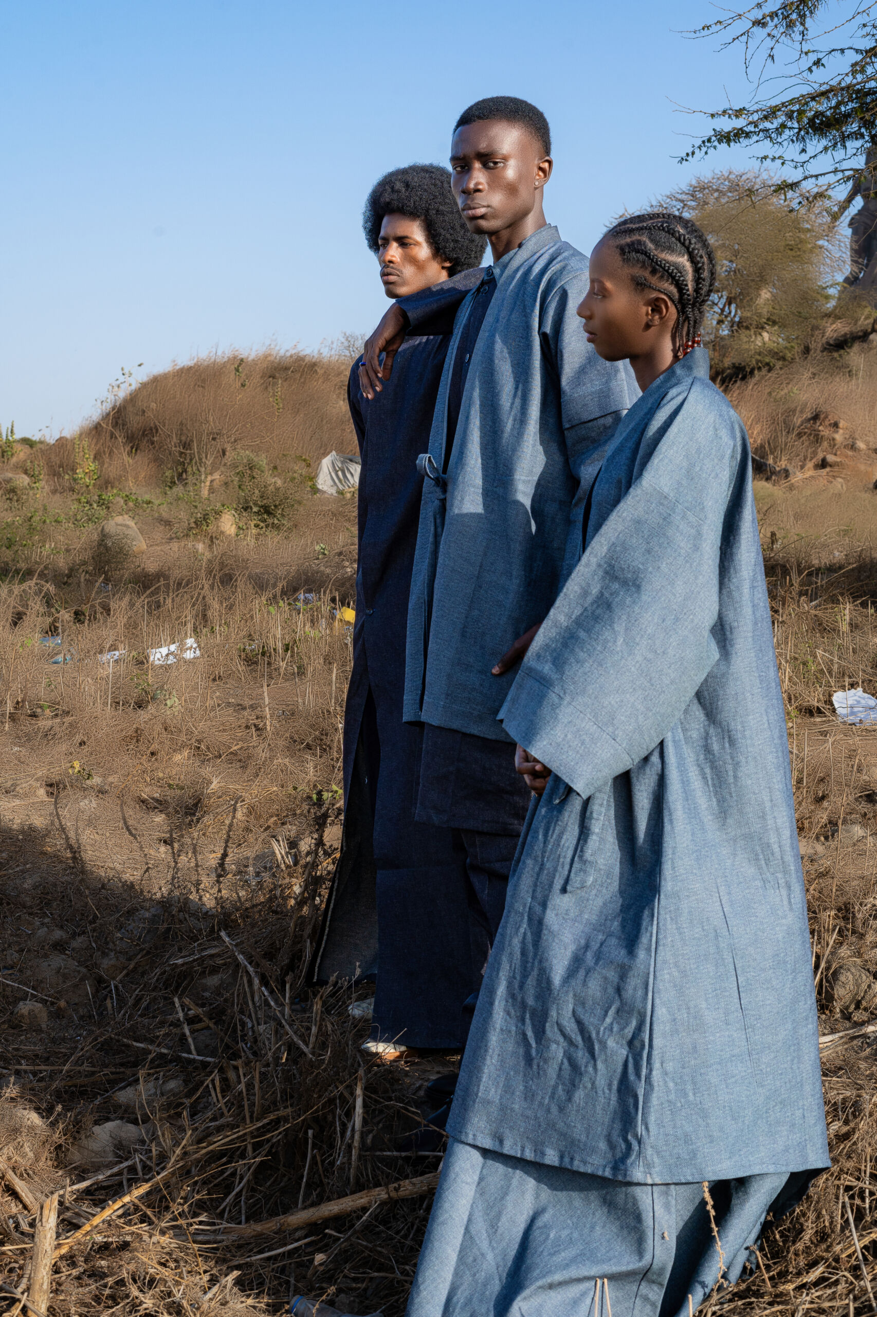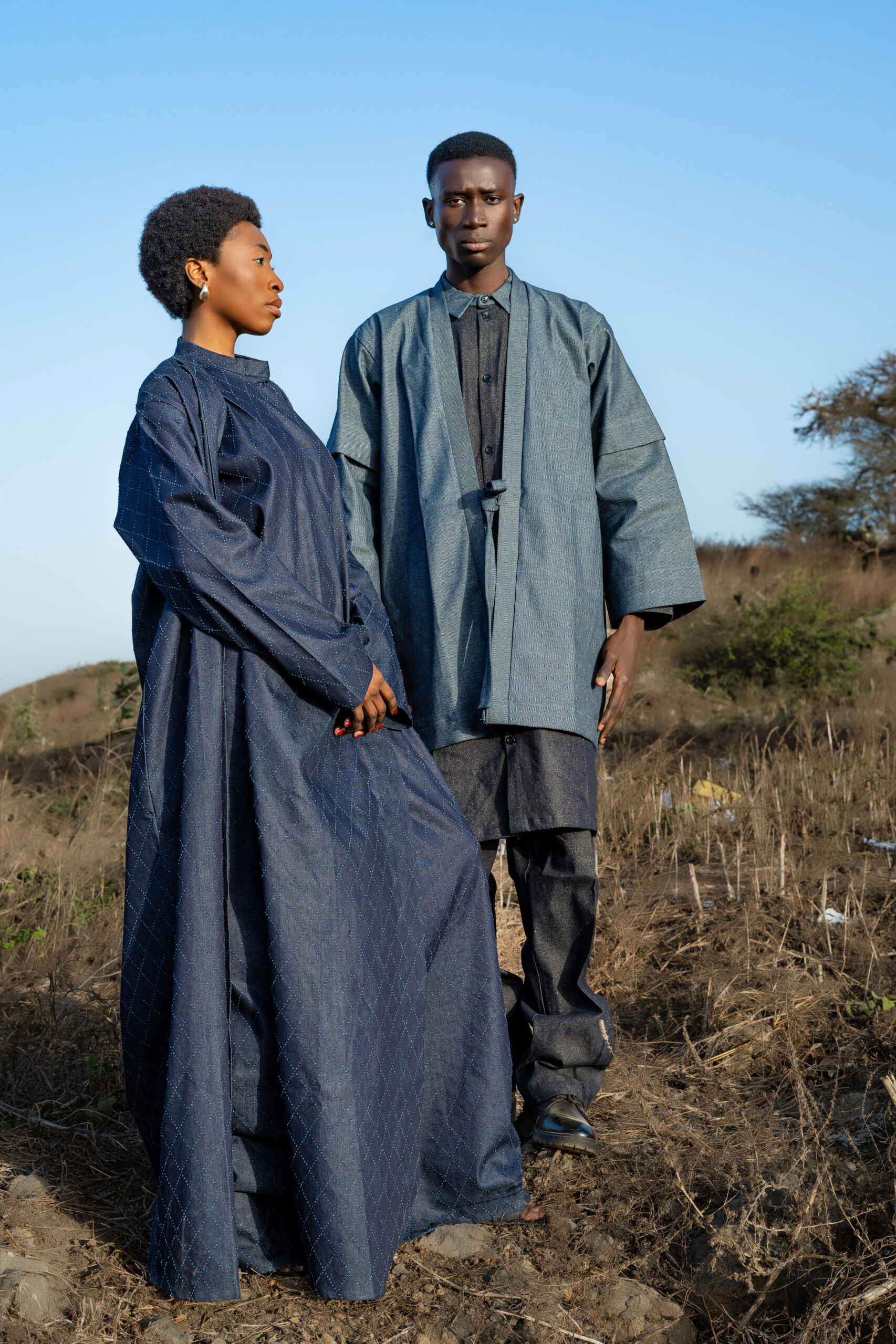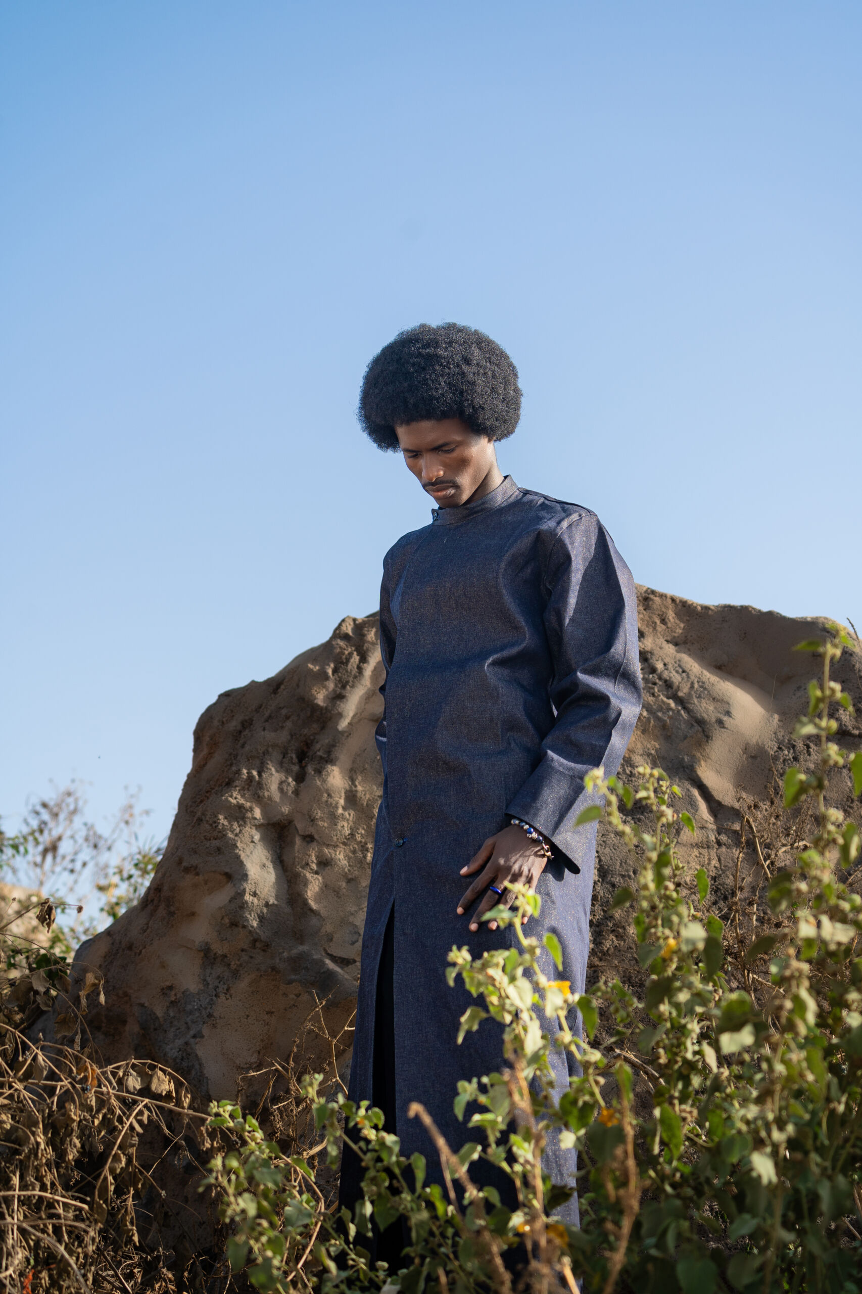 « Le Pont du Silence » (Homme) Il est né entre deux continents. À l’Ouest, les longues étoffes du Sahel, symboles de sagesse et d’autorité. À l’Est, la rigueur du col Mao, ligne droite et pensée juste. Cette pièce raconte l’histoire d’un homme qui ne choisit pas entre ses héritages : il les porte. Le boubou devient seconde peau, sculpté près du corps, épousant l’identité multiple de celui qui marche entre tradition et renouveau. C’est la tenue de l’homme en paix, mais jamais figé.